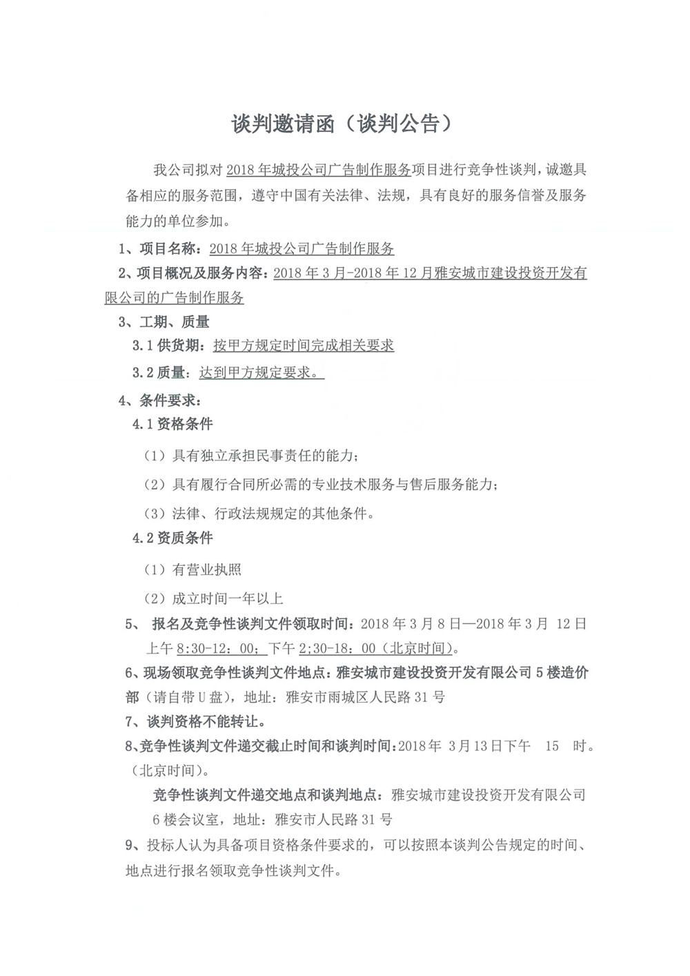 2018年城投公司廣告制作服務項目談判邀請函(談判公告)