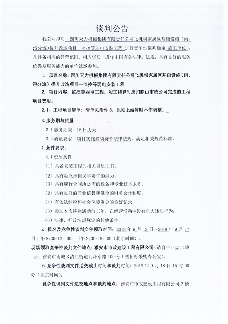四川天力機械集團有限責任公司飛機壩家屬區(qū)基礎(chǔ)設(shè)施(雨、污分流)提升改造項目——監(jiān)控等弱電安裝工程(競爭性談判公告)