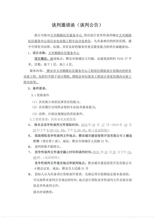 大興順路社區(qū)服務(wù)中心項(xiàng)目水電安裝工程專業(yè)分包單位競(jìng)爭(zhēng)性談判公告