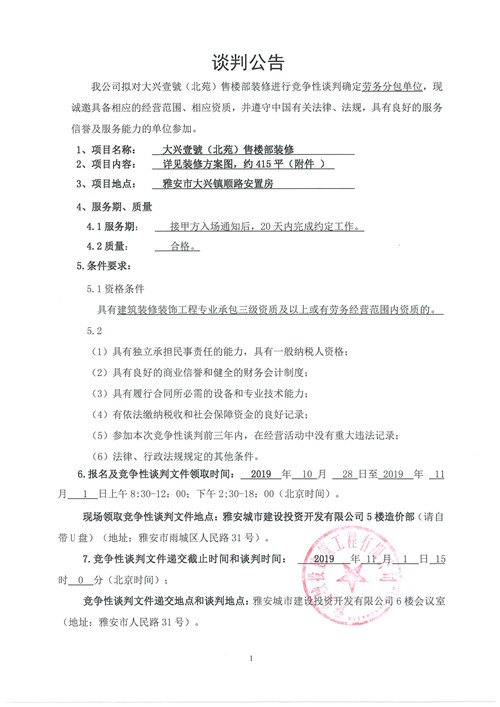 城投建工大興壹號(北苑)售樓部裝修競爭性談判公告