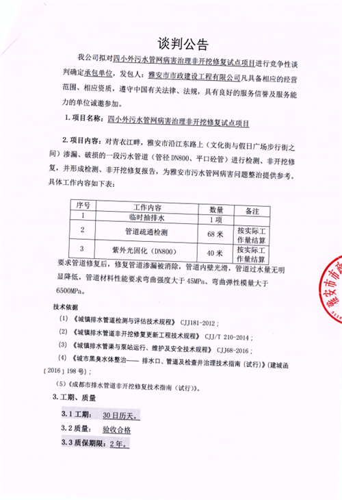 四小外污水管網(wǎng)病害治理非開挖修復(fù)試點(diǎn)項(xiàng)目競(jìng)爭(zhēng)性談判公告(市政公司)