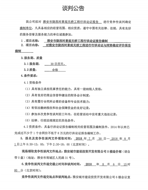 雅安市隴西河景觀天橋工程行洪論證報告競爭性談判公告