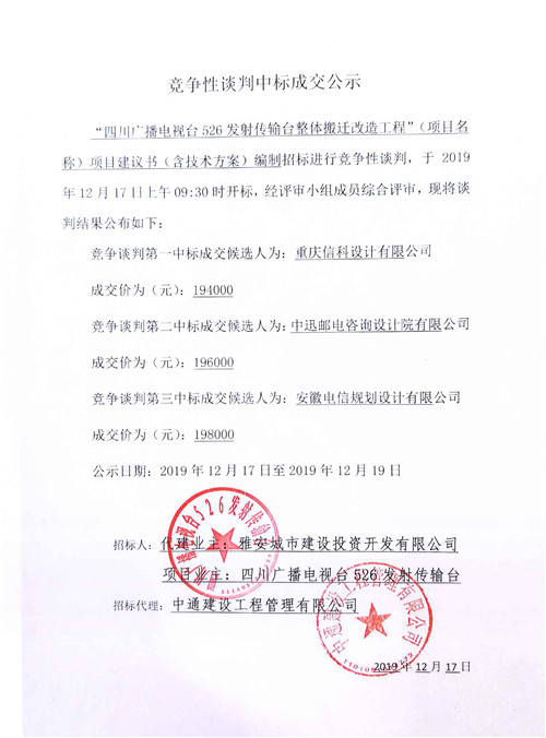 四川廣播電視臺526發(fā)射傳輸臺整體搬遷改造工程項(xiàng)目建議書(含技術(shù)方案)編制招標(biāo)競爭性談判中標(biāo)成交公示