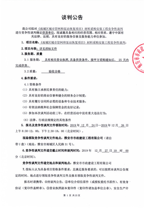 《雨城區(qū)城市管網和泵站恢復項目》材料采購安裝工程競爭性談判公告