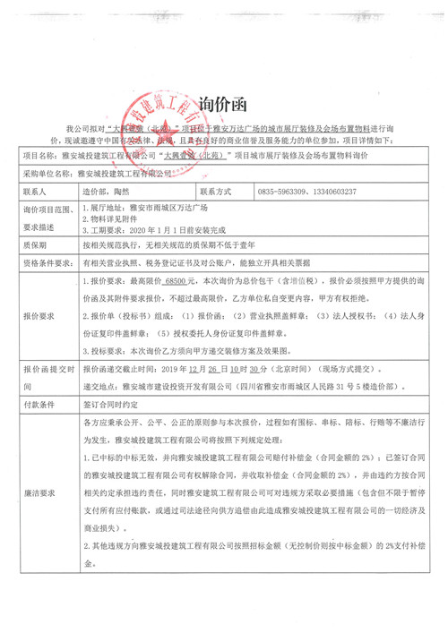 大興壹號(北苑)項目位于雅安萬達(dá)廣場的城市展廳裝修及灰塵布置物料詢價函