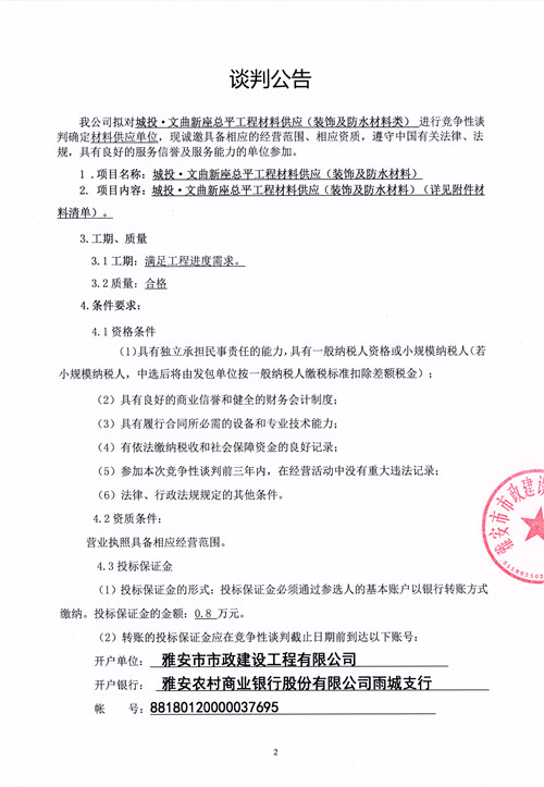 城投·文曲新座總平工程材料供應(yīng)(裝飾及防水材料類)競(jìng)爭(zhēng)性談判公告