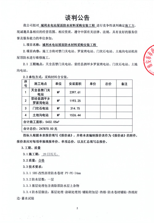 城利水電站屋面防水材料采購安裝工程競爭性談判公告