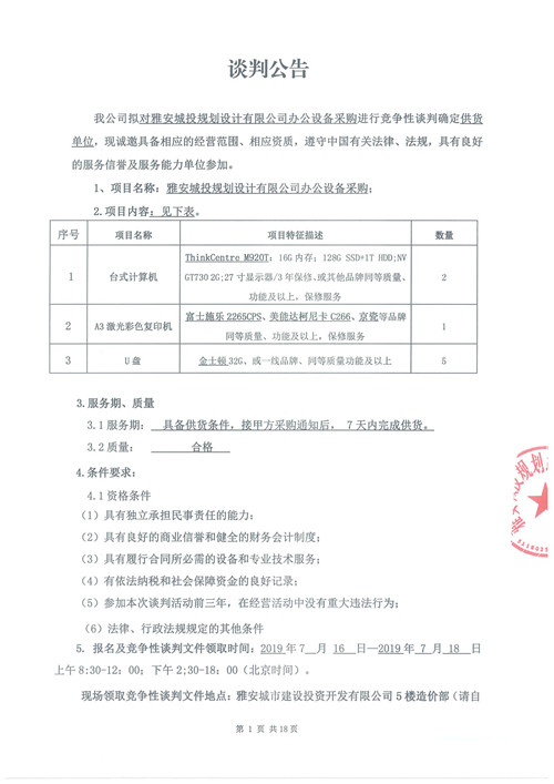 雅安城投規(guī)劃設(shè)計(jì)有限公司辦公設(shè)備采購競爭性談判公告