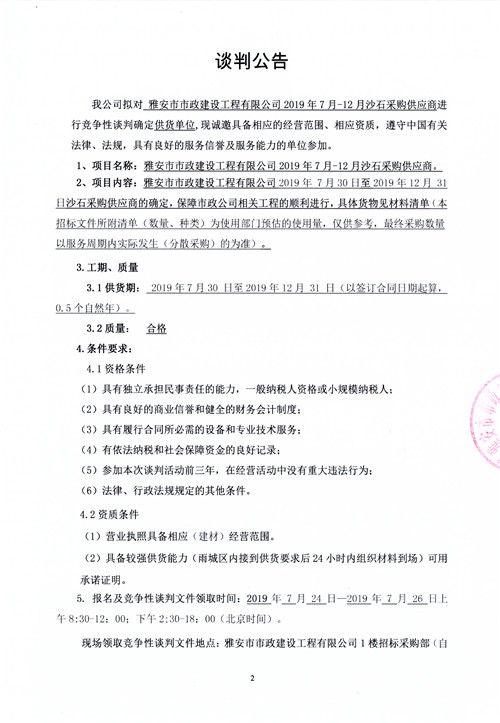 市政公司2019年7月-12月沙石采購供應(yīng)商競爭性談判公告