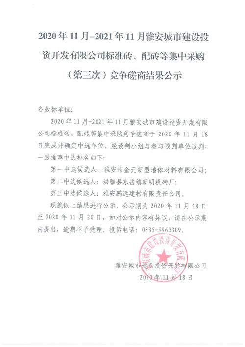 2020年11月-2021年11月雅安城市建設(shè)投資開發(fā)有限公司標準磚、配磚等集中采購(第三次)競爭磋商結(jié)果公示