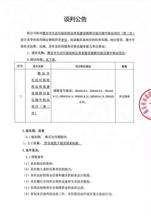 雅安市生活垃圾轉(zhuǎn)運體系建設姚橋垃圾壓縮中轉(zhuǎn)站項目確定鋼筋供貨單位的競爭性談判公告(第二次)