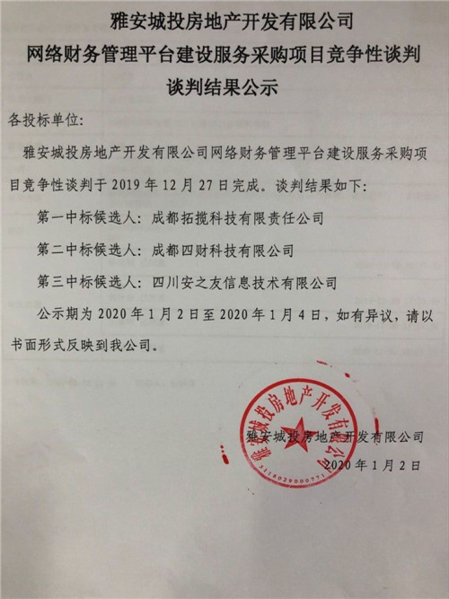 雅安城投房地產(chǎn)開發(fā)有限公司網(wǎng)絡財務管理平臺建設服務采購項目競爭性談判結(jié)果公司