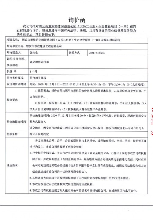 市政公司 周公山麓旅游休閑濕地公園(大興二臺(tái)地)生態(tài)建設(shè)項(xiàng)目(一期)花崗石材料詢價(jià)函