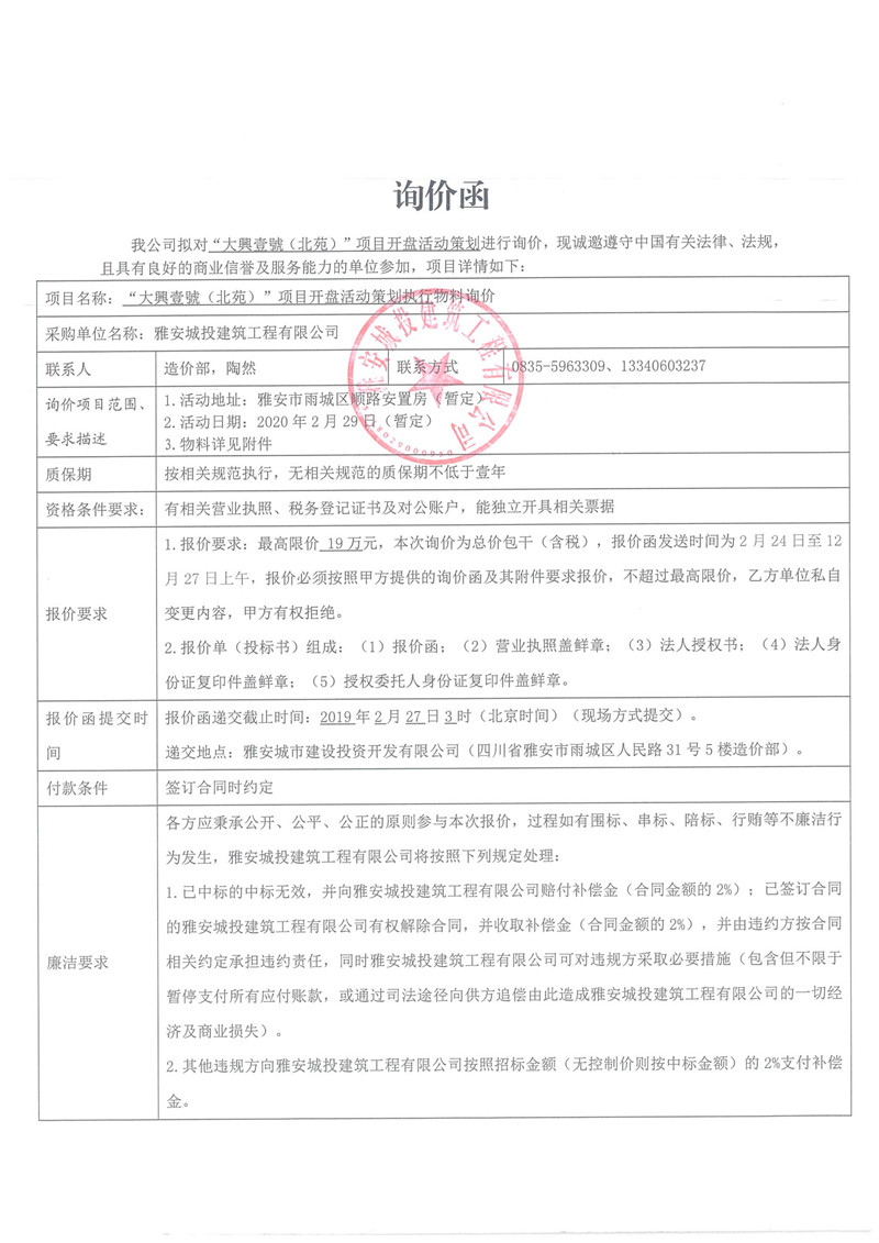 “大興壹號(北苑)”項(xiàng)目開盤活動策劃詢價函