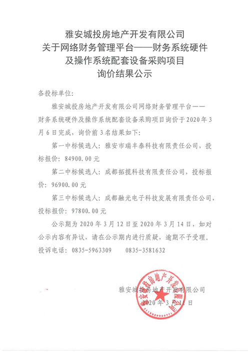 城投房地產公司關于網(wǎng)絡財務管理平臺——財務系統(tǒng)硬件及操作系統(tǒng)配套設備采購項目詢價結果公示