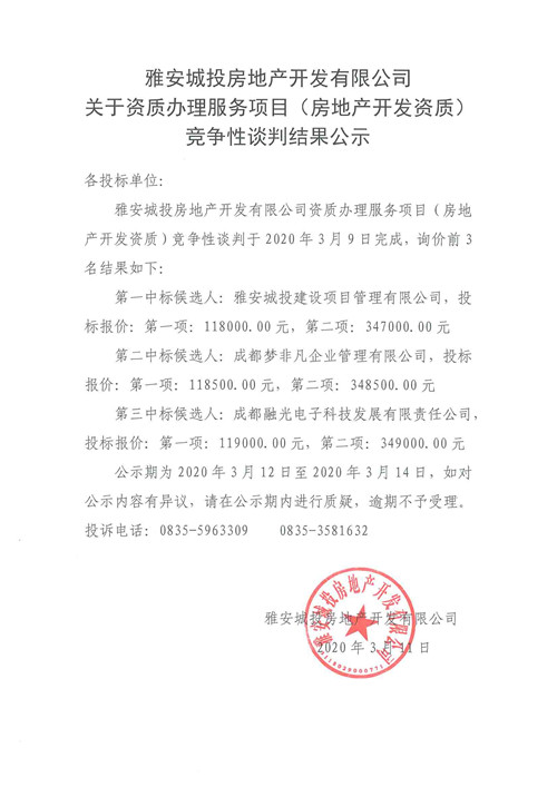 城投地產(chǎn)公司關于資質(zhì)辦理服務項目(房地產(chǎn)開發(fā)資質(zhì))競爭性談判結(jié)果公示