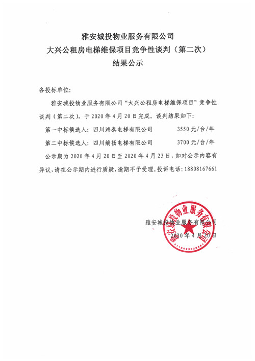 城投物業(yè)公司大興公租房電梯維保項(xiàng)目競(jìng)爭(zhēng)性談判(第二次)結(jié)果公示
