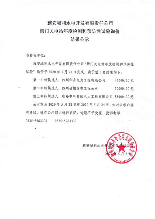 城利水電公司禁門關電站年度檢測和預防性試驗詢價結果公示