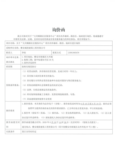 城投建工“大興順路社區(qū)服務(wù)中心”項目內(nèi)外墻磚、路沿石、地磚詢價函