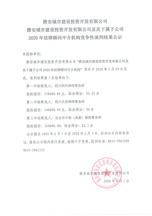 雅安城市建設投資開發(fā)有限公司及其下屬子公司2020年法律顧問中介機構(gòu)競爭性談判結(jié)果公示