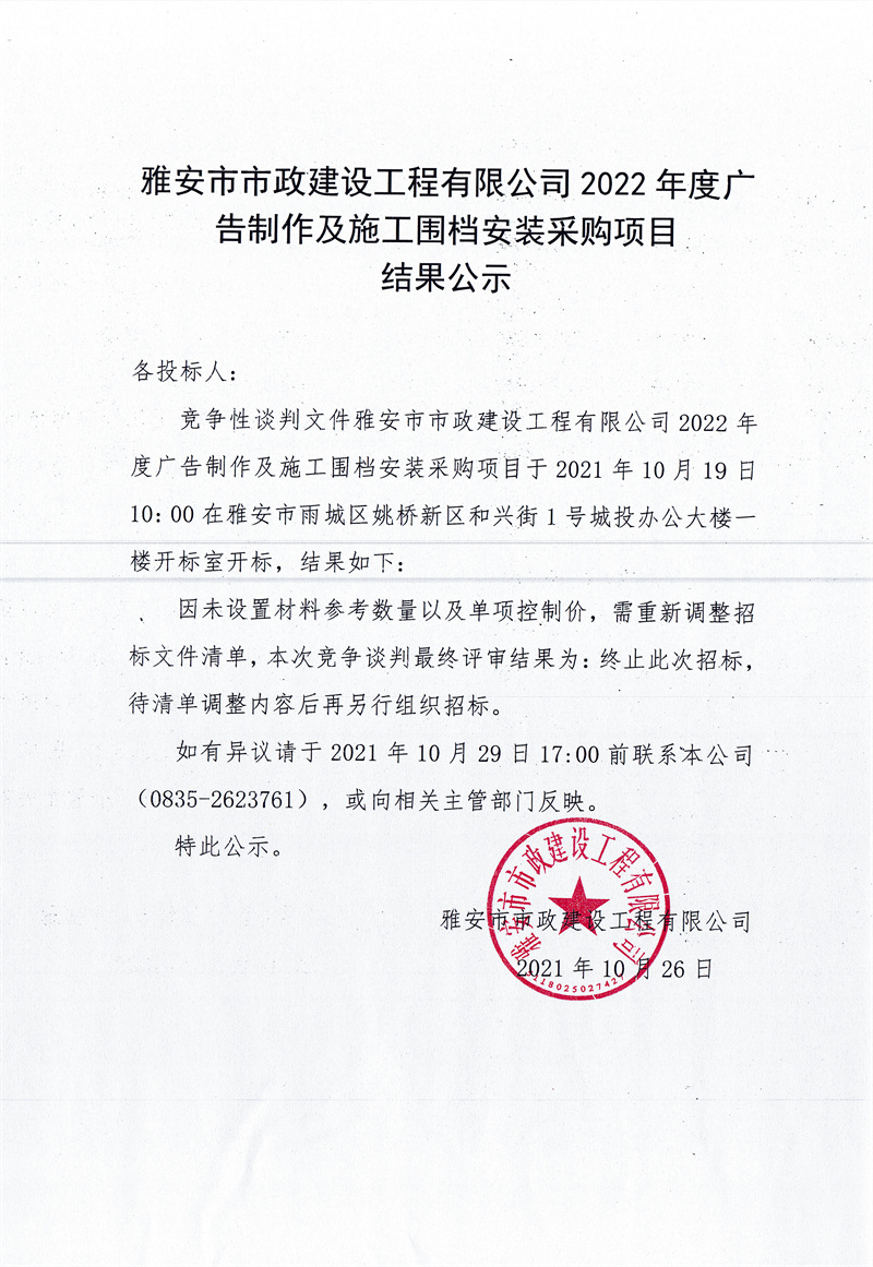 雅安市市政建設(shè)工程有限公司2022年度廣告制作及施工圍檔安裝采購項(xiàng)目競爭性談判結(jié)果公示