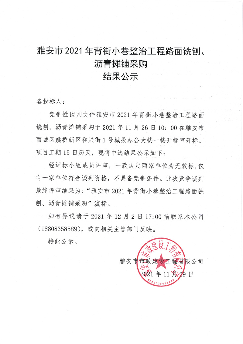 雅安市2021年背街小巷整治工程路面銑刨、瀝青攤鋪采購結(jié)果公示