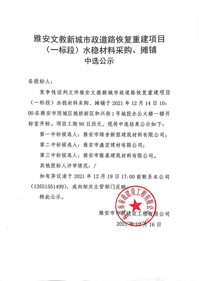 雅安文教新城市政道路恢復(fù)重建項(xiàng)目(一標(biāo)段)水穩(wěn)層材料采購(gòu)、攤鋪中選公示