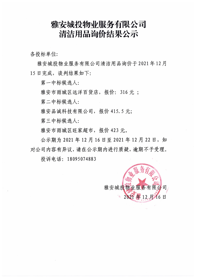 雅安城投物業(yè)服務有限公司清潔用品詢價結(jié)果公示