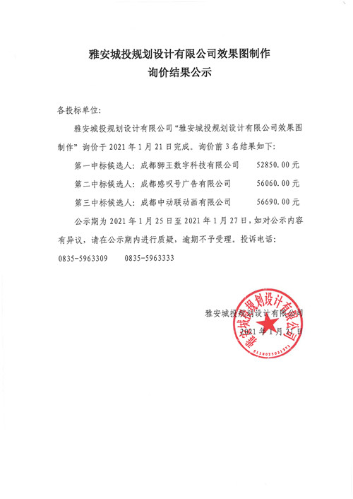 雅安城投規(guī)劃設(shè)計(jì)有限公司效果圖制作詢(xún)價(jià)結(jié)果公示