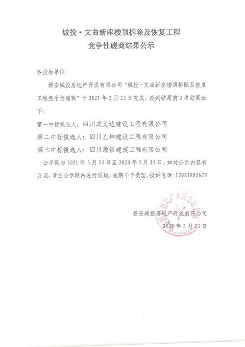 城投·文曲新座樓頂拆除及恢復工程競爭性磋商結果公示