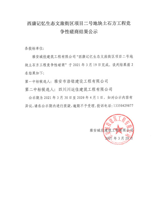 城投建工公司雅安市西康記憶生態(tài)文旅街區(qū)項目二號地塊土石方工程競爭性磋商結果公示