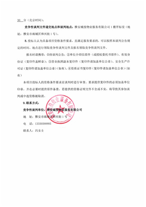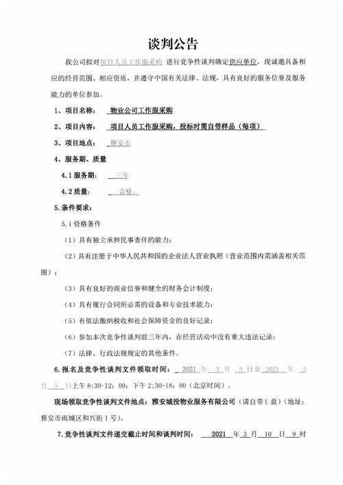 城投物業(yè)公司項目人員工作服采購競爭性談判公告