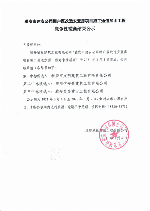 城投建工公司雅安市建安公司棚戶(hù)區(qū)改造安置房項(xiàng)目施工通道加固工程競(jìng)爭(zhēng)性磋商結(jié)果公示