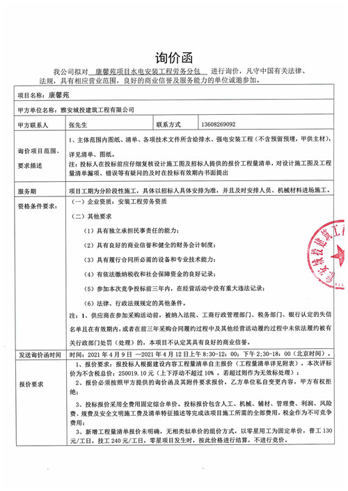 城投建工公司項(xiàng)目水電安裝工程勞務(wù)分包詢價(jià)函