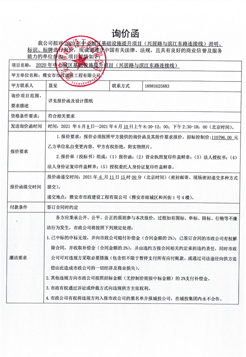雅安市政公司2020年中心城區(qū)基礎(chǔ)設(shè)施提升項(xiàng)目(興居路與濱江東路連接線)照明、標(biāo)識(shí)、標(biāo)牌詢價(jià)函