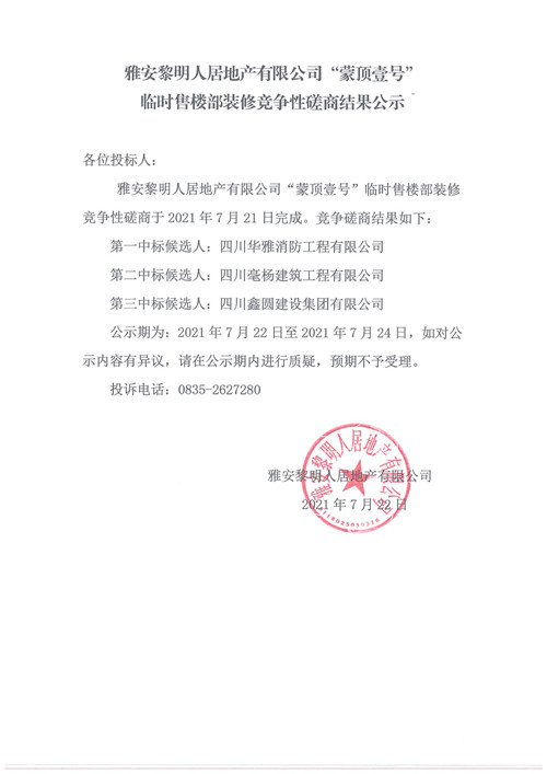 黎明人居公司黎明·蒙頂壹號臨時售樓部裝飾裝修競爭性磋商結(jié)果公示