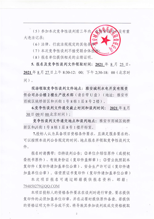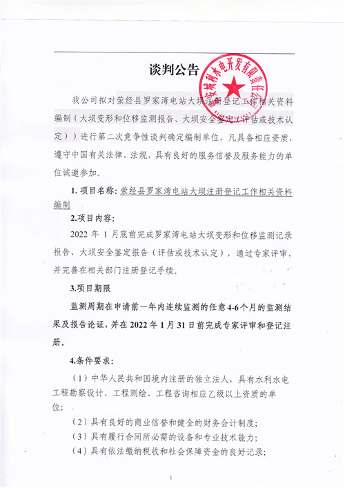 城利水電公司滎經(jīng)縣羅家灣電站大壩注冊(cè)登記工作相關(guān)資料編制競爭性談判公告(第二次)