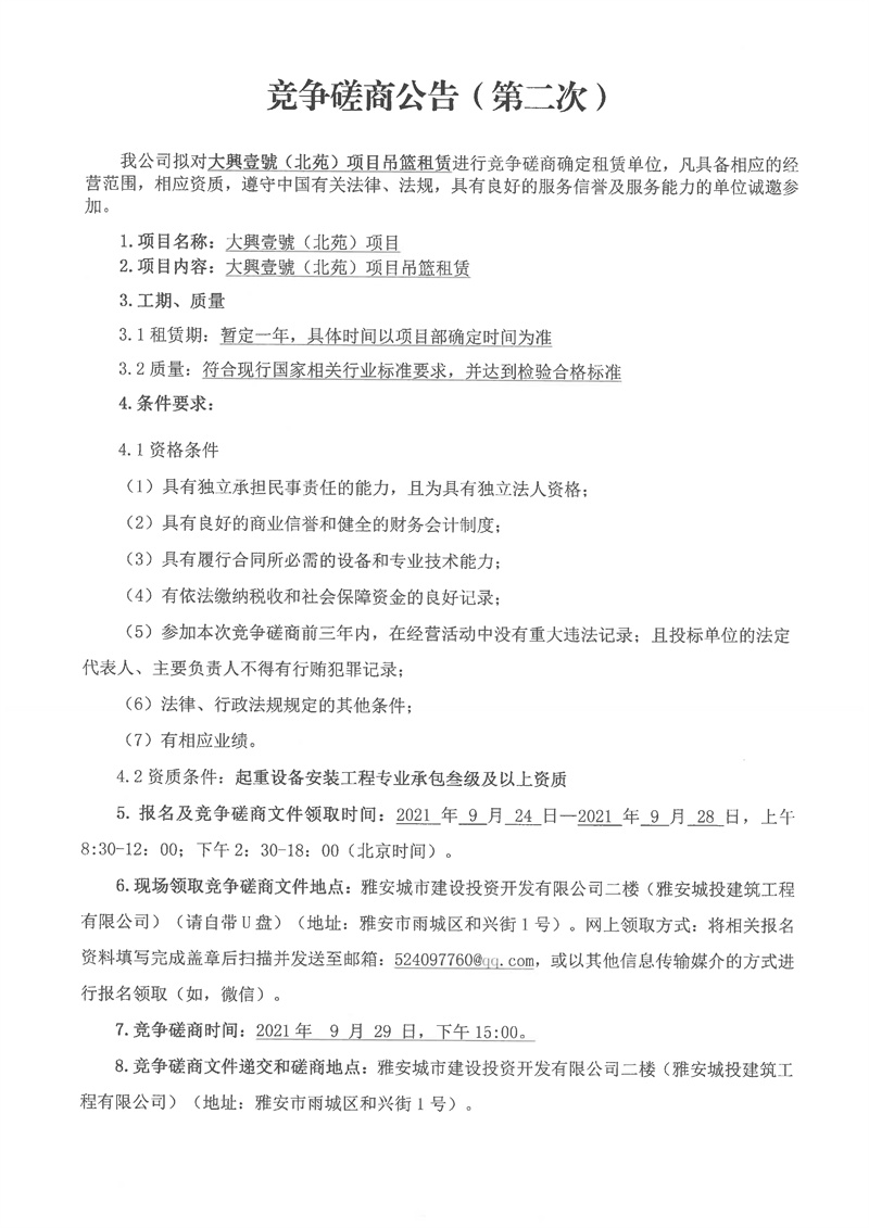 大興壹號(北苑)項目吊籃租賃競爭性磋商(第二次)公告