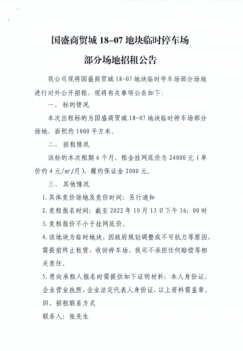 國(guó)盛商貿(mào)城18-07地塊臨時(shí)停車場(chǎng)部分場(chǎng)地招租公告