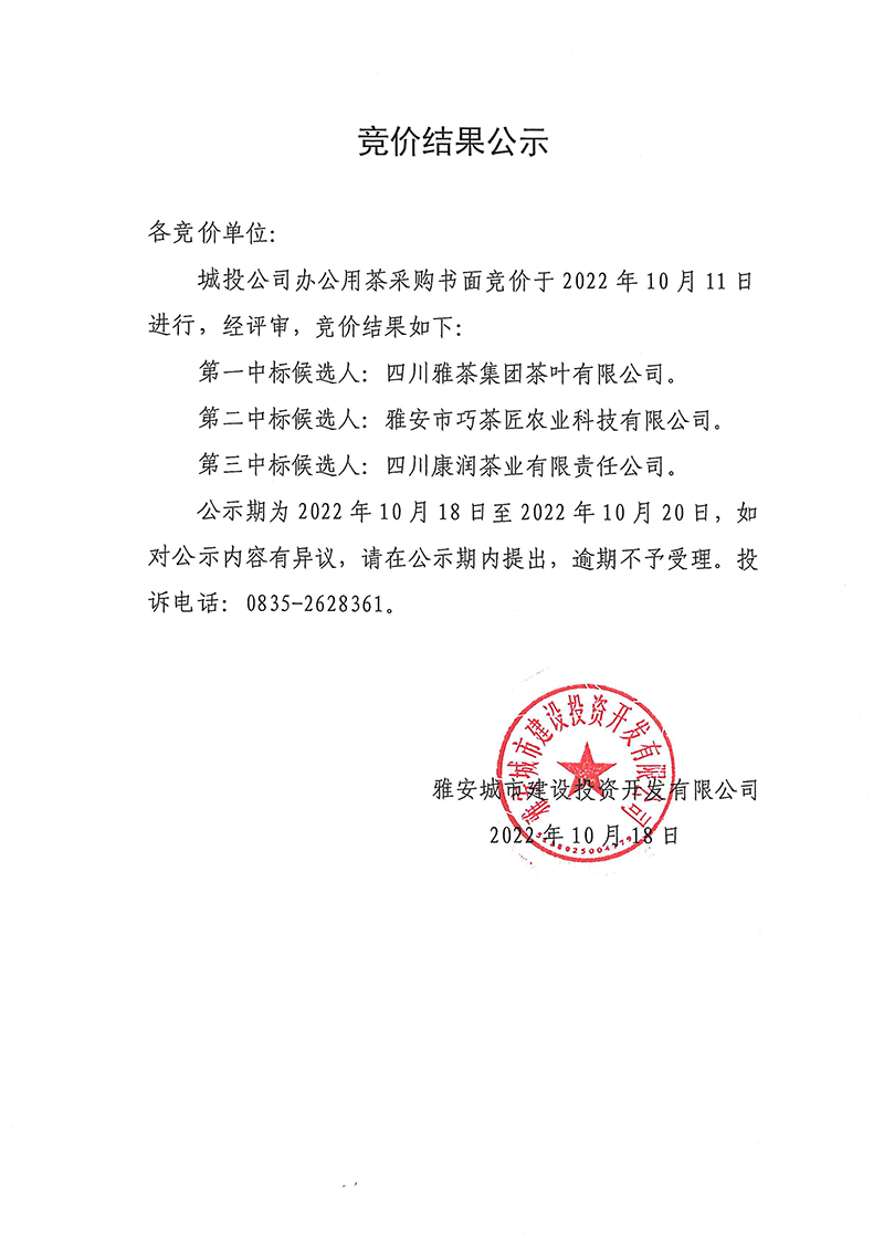 城投公司辦公用茶競價結果公示