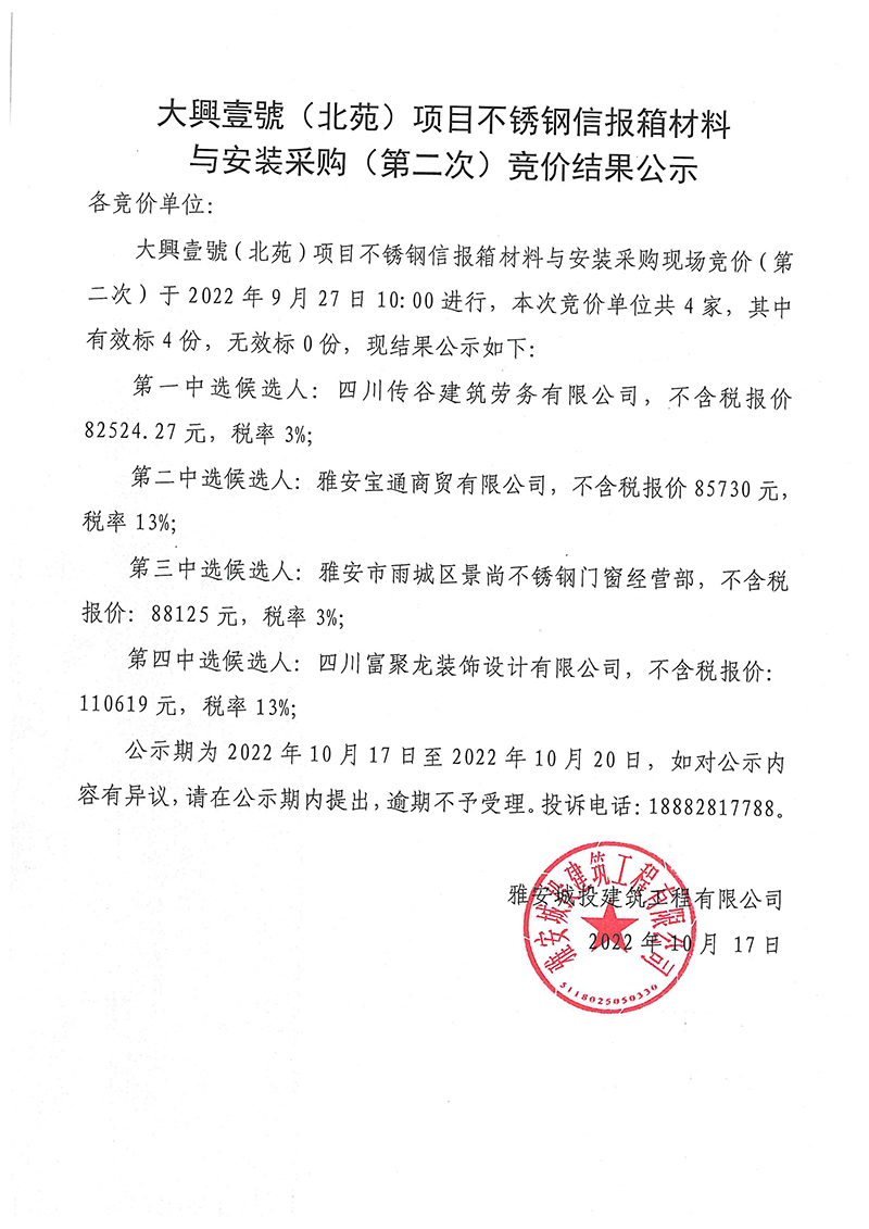 大興壹號(北苑)項目不銹鋼信報箱材料與安裝采購(第二次)競價結果公示