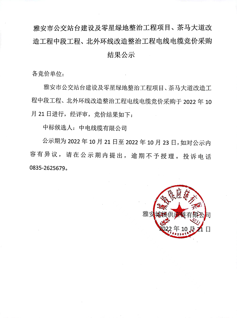 雅安市公交站臺建設(shè)及零星綠地整治工程項目、茶馬大道改造工程中段工程、北外環(huán)線改造整治工程電線電纜采購競價結(jié)果公告