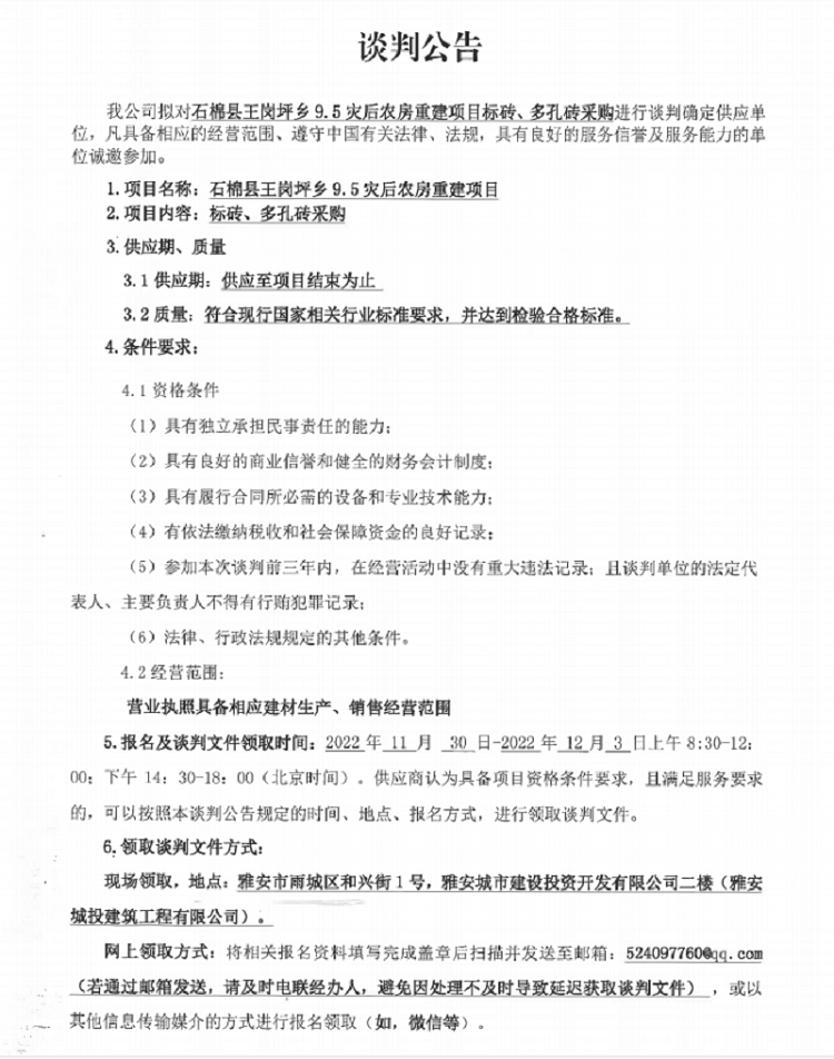 石棉縣王崗坪鄉(xiāng)9.5災(zāi)后農(nóng)房重建項(xiàng)目標(biāo)磚、多孔磚采購談判公告