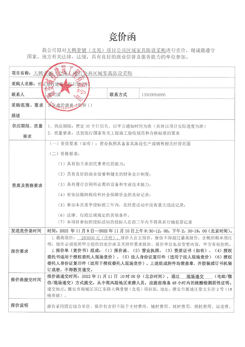 大興壹號(hào)(北苑)項(xiàng)目公共區(qū)域家具陳設(shè)采購競(jìng)價(jià)函