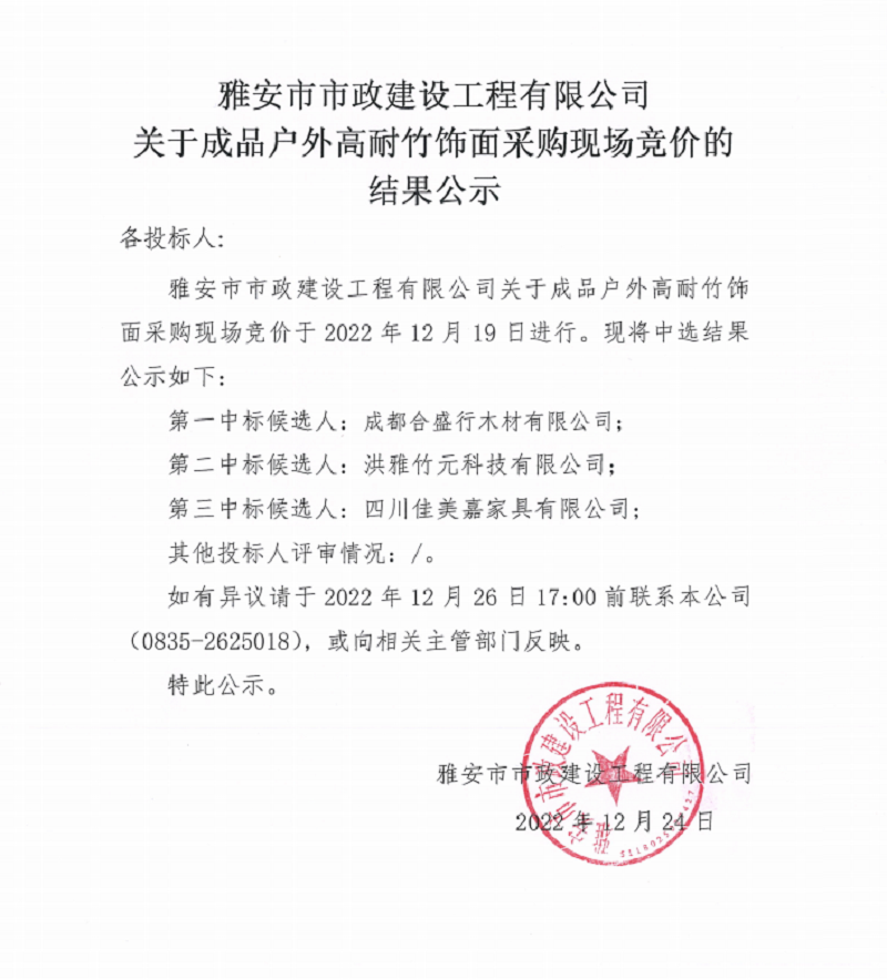 雅安市市政建設(shè)工程有限公司關(guān)于成品戶外高耐竹飾面采購現(xiàn)場競價(jià)結(jié)果公示