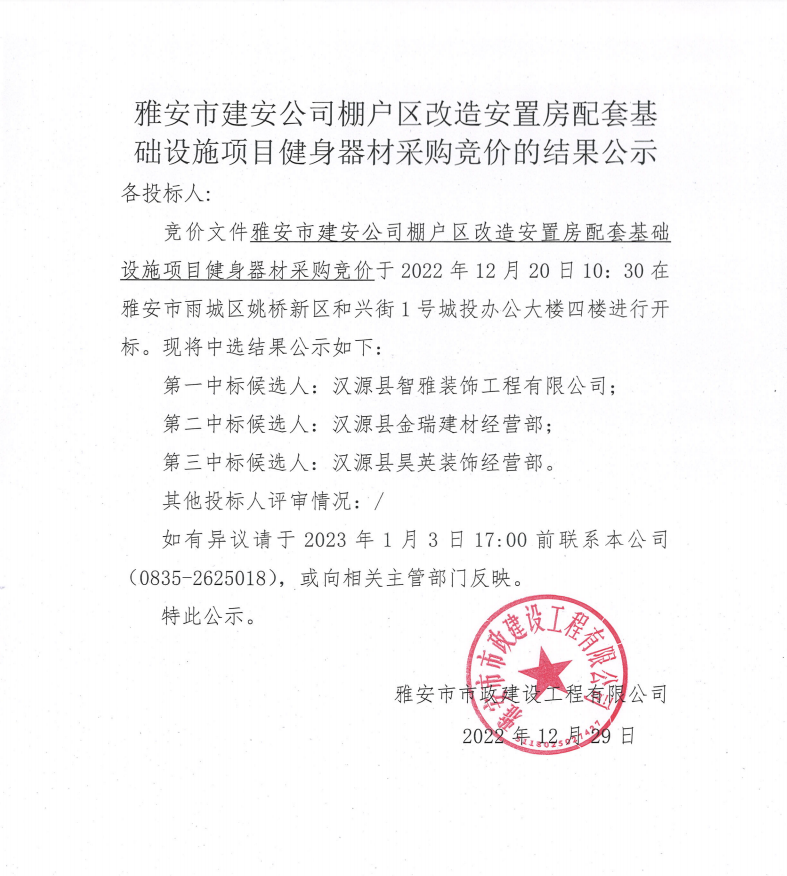 雅安市建安公司棚戶區(qū)改造安置房配套基礎(chǔ)設(shè)施項(xiàng)目健身器材采購(gòu)競(jìng)價(jià)結(jié)果公示