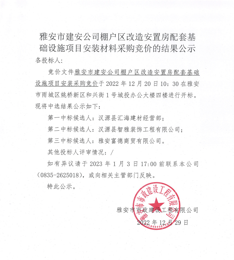 雅安市建安公司棚戶區(qū)改造安置房配套基礎(chǔ)設(shè)施項目安裝材料采購競價結(jié)果公示