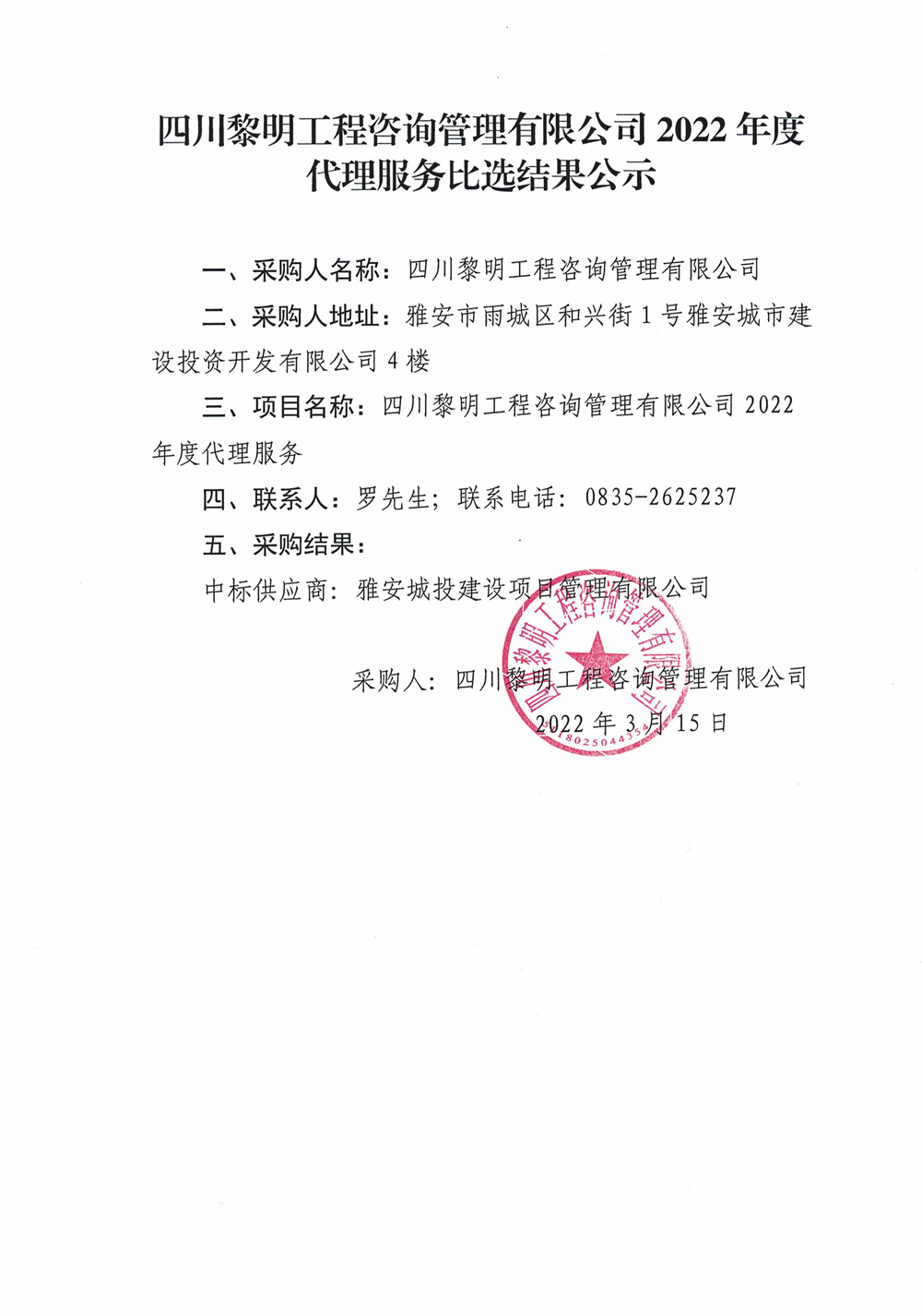 四川黎明工程咨詢管理有限公司2022年度代理服務(wù)必選結(jié)果公示