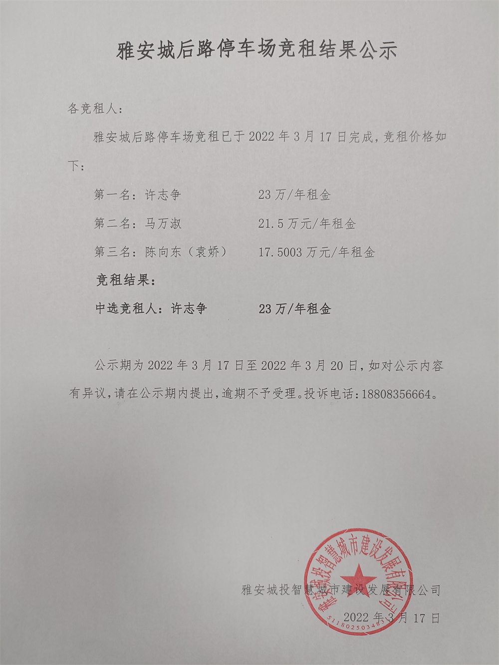 雅安城后路停車(chē)場(chǎng)競(jìng)租結(jié)果公示