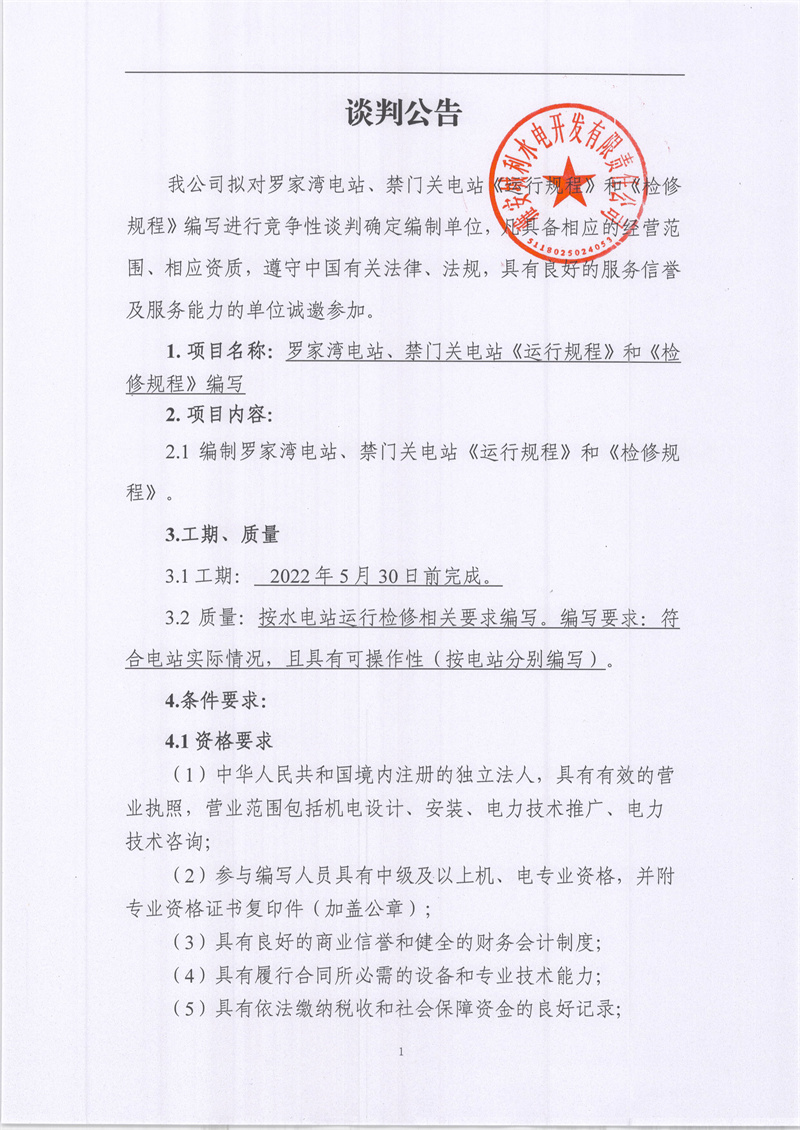 羅家灣電站、禁門關(guān)電站《運(yùn)行規(guī)程》和《檢修規(guī)程》編寫競(jìng)爭(zhēng)性談判公告